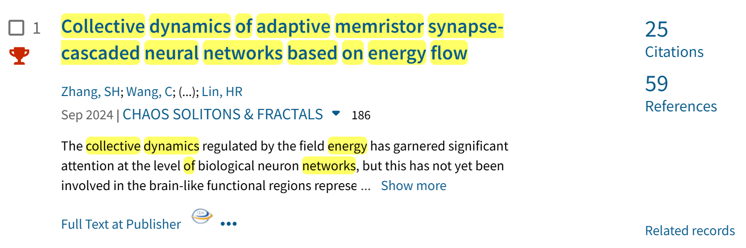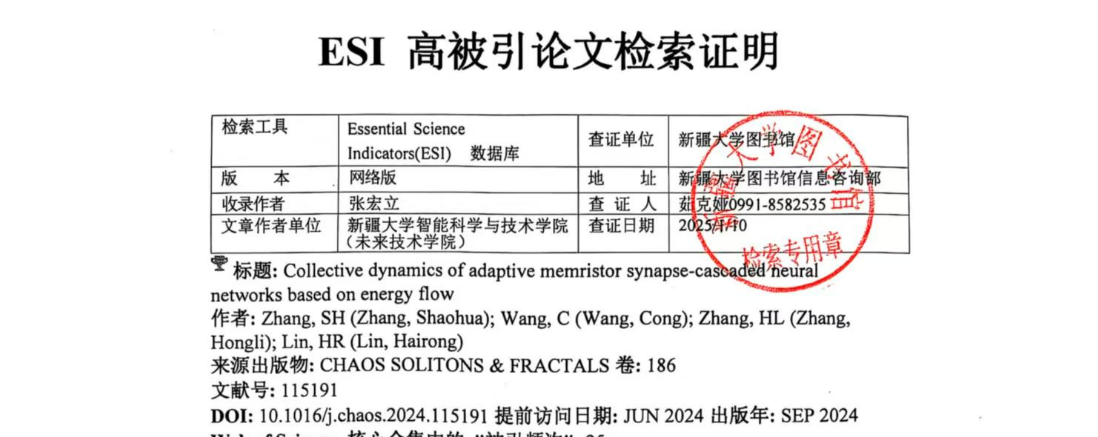 张宏立教授团队在非线性动力学领域权威期刊Chaos, Solitons & Fractals(中科院一区,IF=5.3)上发表的文章“Collective dynamics of adaptive memristor synapse-cascaded neural networks based on energy flow”入选ESI全球TOP1%高被引论文。这表明团队在忆阻神经系统动力学方面的研究成果受到了国内外同行的广泛关注。这篇论文第一作者是张宏立教授的博士研究生张绍华同学。